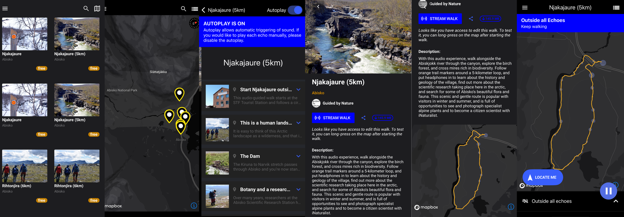 Ladda ner gratisappen ECHOES Interactive Sound Walks app , och välj en vacker vandringsled i Abisko nationalpark.