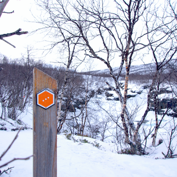Follow red trail markers to hike through forest and apline scrub, cross a waterfall and snowfields, and summit Mount Nuolja. This audio experience is 6 kilometres from the top to the bottom and is only available in the summer.